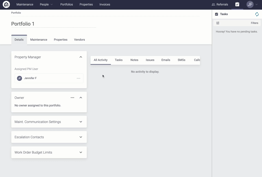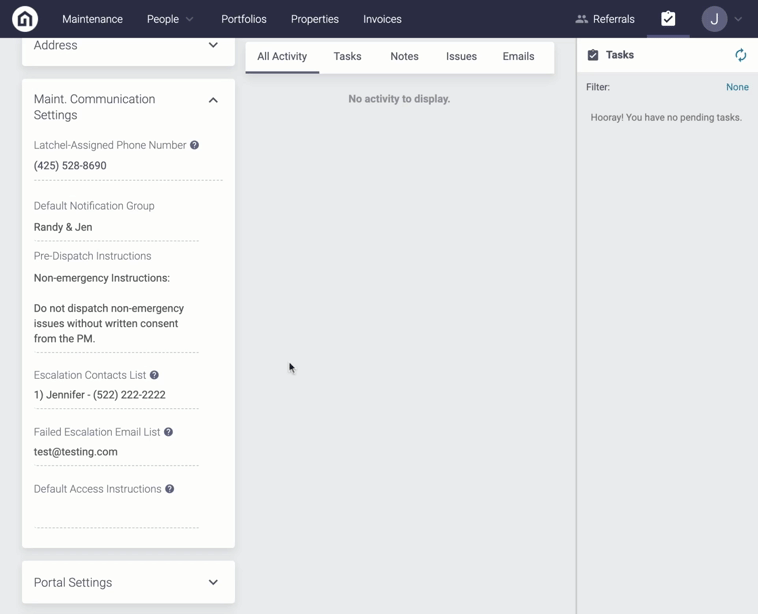 Step 4. Under the Details tab, scroll down to the Maint. Communication Settings section. From here, you will see the property inherited the Access Instructions from the Portfolio level. To override this, click override and then select then type the property’s Access Instructions and then click Save.