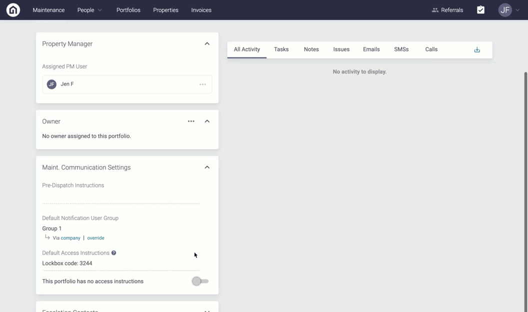 Step 3. On the Details page, scroll down to the Maintenance Communication Settings. From here, you will see the Company Level Notification User Group was automatically applied to the portfolio. To override the Company Level, click override and then select the User Group from the dropdown under the Default User Group field. Click Save.